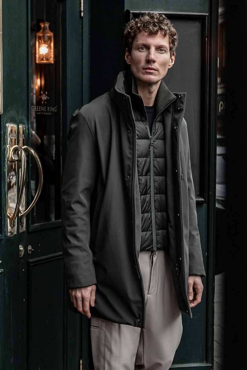 DUNOのコンテンポラリーなアウターウェアは、上質な素材と先端技術、現代のライフスタイルと伝統的なイタリアンテイラリング技術の融合によって産み出されています。防風、撥水性に優れた機能的な素材を使用し、羽抜を防ぐダブルパックに上質なダウンが詰められています。